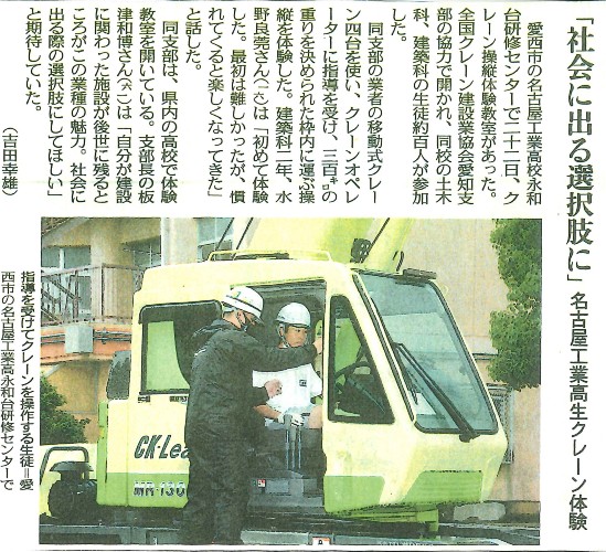 2022.06.28 名古屋工業高校永和台研修センターにてクレーン操作の指導を行いました。 CKリース株式会社は全国クレーン建設業協会のクレーン操縦体験教室で、名古屋国業高校の生徒さんにクレーン操作の指導を行いました。 同校永和台研修センターで行われ、約百人が参加いたしました。